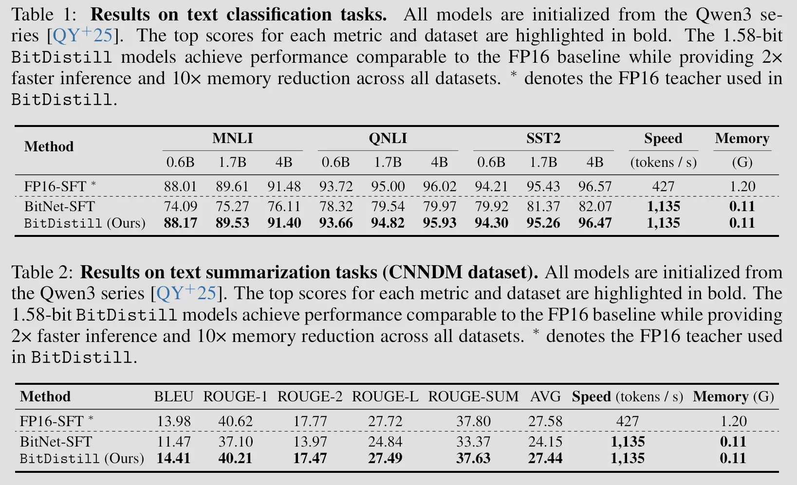 It introduced a fine-tuning pipeline BitDistill that can turn off-the-shelf full-precision LLMs (e.g., Qwen) into 1.58-bit precision (i.e., ternary weights {-1, 0, 1}) to achieve strong task-specific performance with minimal computational cost