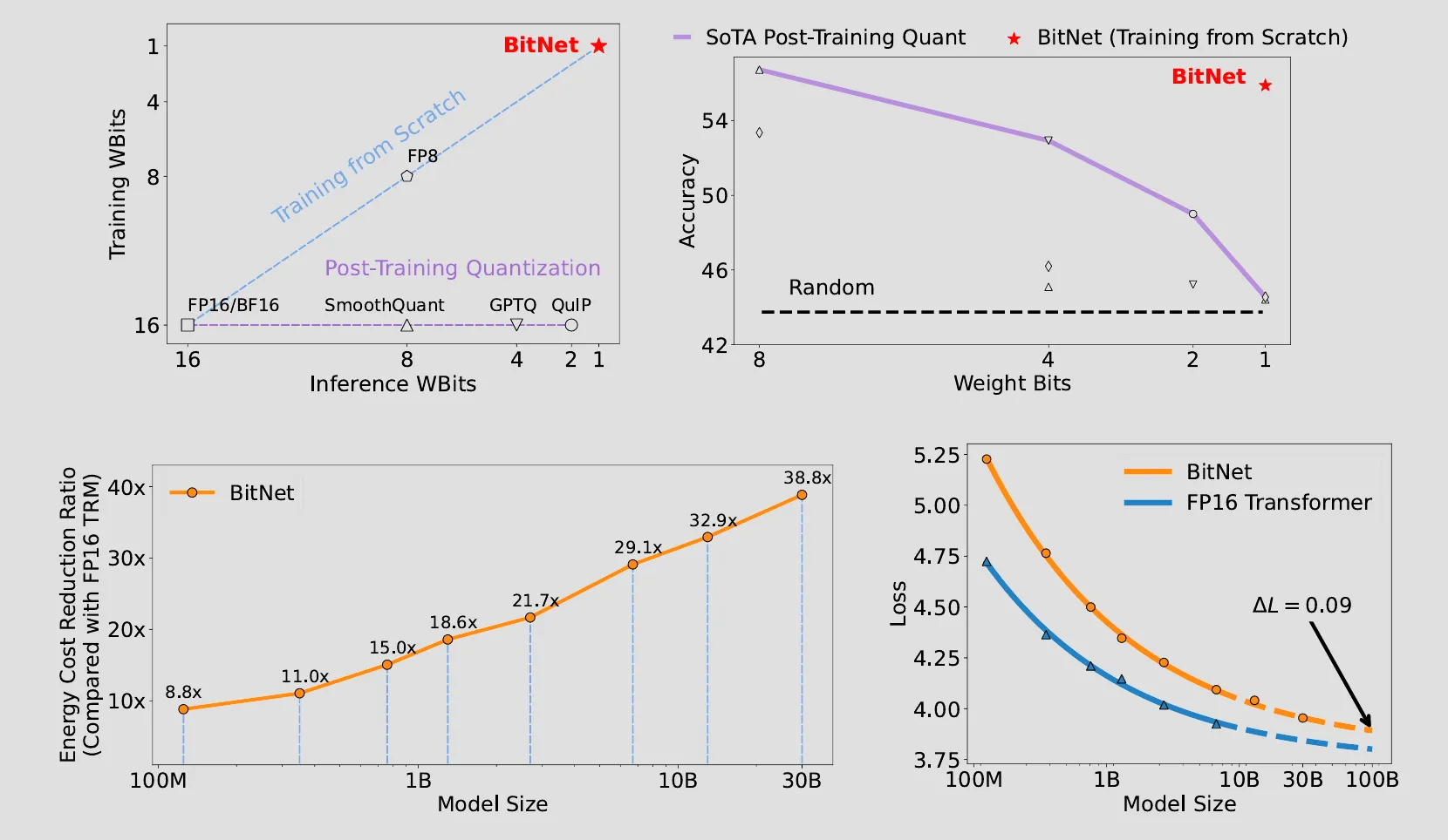 The results shown from BitNet paper indicates transformer models only need binarized weights to performer as well as same models with high-precision weights, and we can use those saved computation to make model even bigger & deeper which will perform much better than a smaller model with same amounts of bits for weights, this is almost the closest thing to a free lunch as one can get!