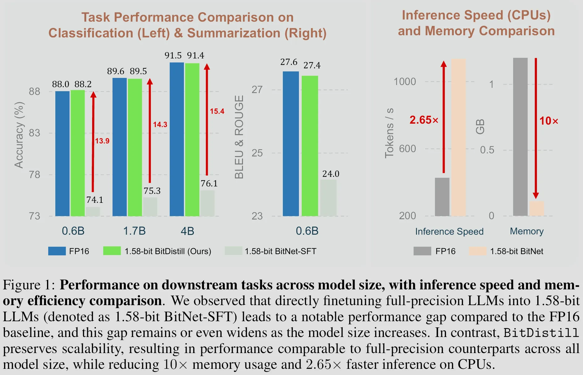It introduced a fine-tuning pipeline BitDistill that can turn off-the-shelf full-precision LLMs (e.g., Qwen) into 1.58-bit precision (i.e., ternary weights {-1, 0, 1}) to achieve strong task-specific performance with minimal computational cost